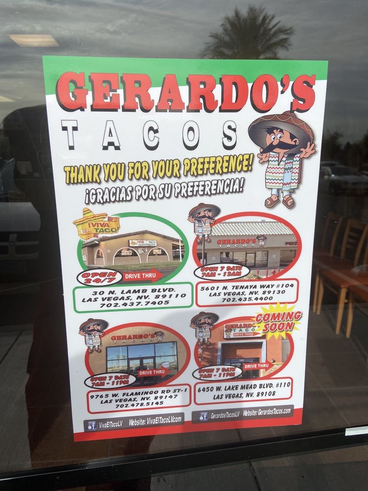 Welcome to Gerardo’s Taco, where authentic Mexican flavors come to life right in the heart of Las Vegas. Located at 6450 W Lake Mead, this vibrant eatery serves a mouthwatering array of traditional dishes that cater to every taco lover's craving. Whether you’re in the mood for a hearty Bistec de Pollo or the comforting warmth of Beef Soup, you’re in for a treat.